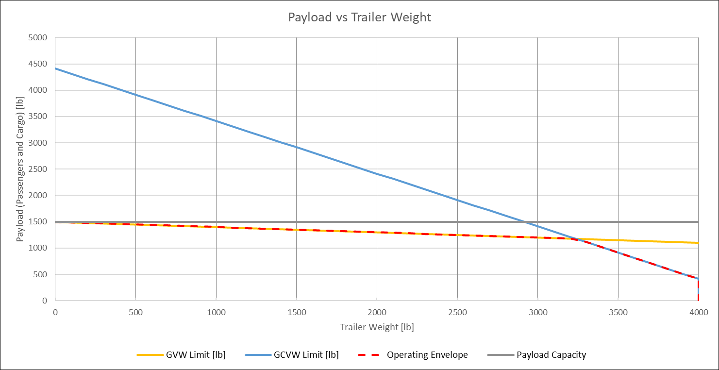 Anyway, I created a chart showing the relationship between payload capacity and trailer weight to better illustrate how much payload I can carry, and how heavy of a trailer I can haul.
